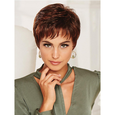 Découvrez notre perruque brune et bouclée pour femme, parfaite pour rehausser les coiffures courtes avec des textures volumineuses et dégradées et apporter une touche d'élégance à votre look.