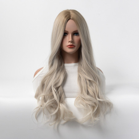 Voici notre perruque ondulée blond polaire en fibres Kanekalon, parfaite pour un look naturel et élégant en toute occasion. Son bonnet en filet assure son confort et sa raie centrale ajoute du style à votre coiffure.